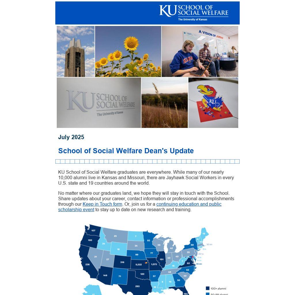 KU School of Social Welfare graduates are everywhere. While many of our nearly 10,000 alumni live in Kansas and Missouri, there are Jayhawk Social Workers in every U.S. state and 19 countries around the world.