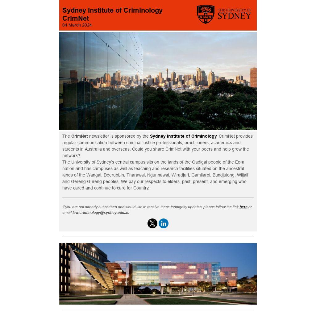 Please add law.criminology@sydney.edu.au to your address book or senders safe list to make sure you continue to see our emails in the future.