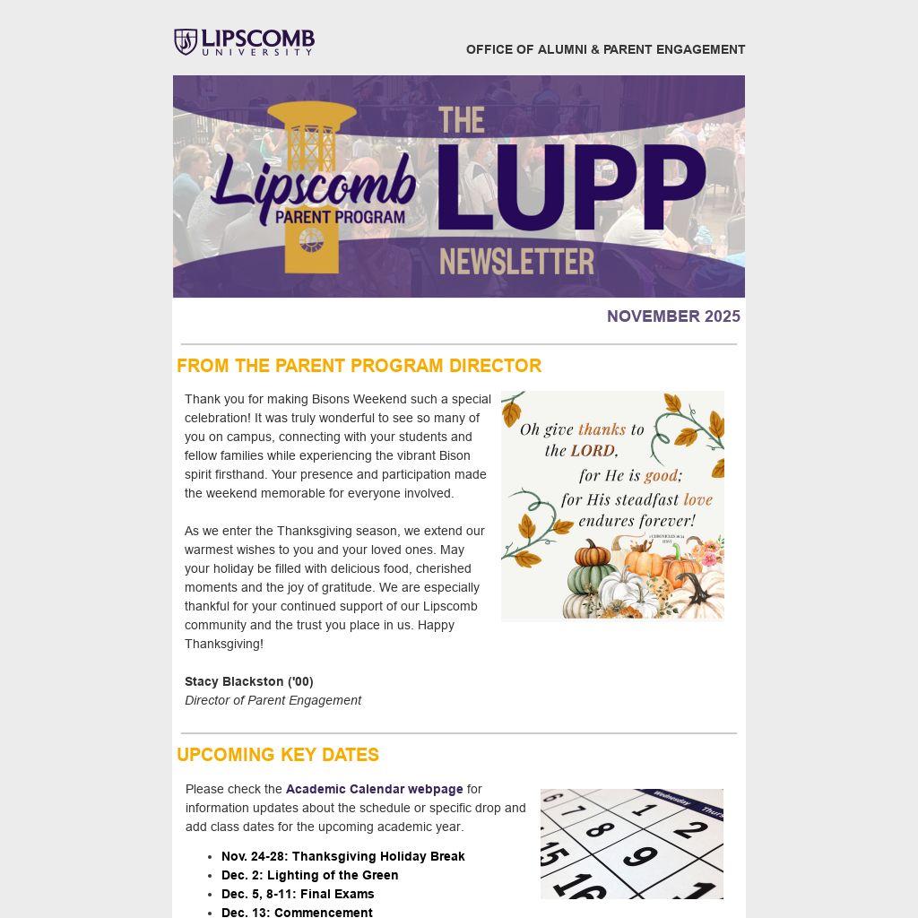 If your company hires interns and does not yet have a recruiting relationship with Lipscomb University, please reach out to us about setting up an account on our electronic job board. Our community network is our largest asset as we connect students to real world opportunities, and while you cannot serve as a direct supervisor for your child, you could open up a life-changing opportunity for one of their classmates or friends just by spreading the word.