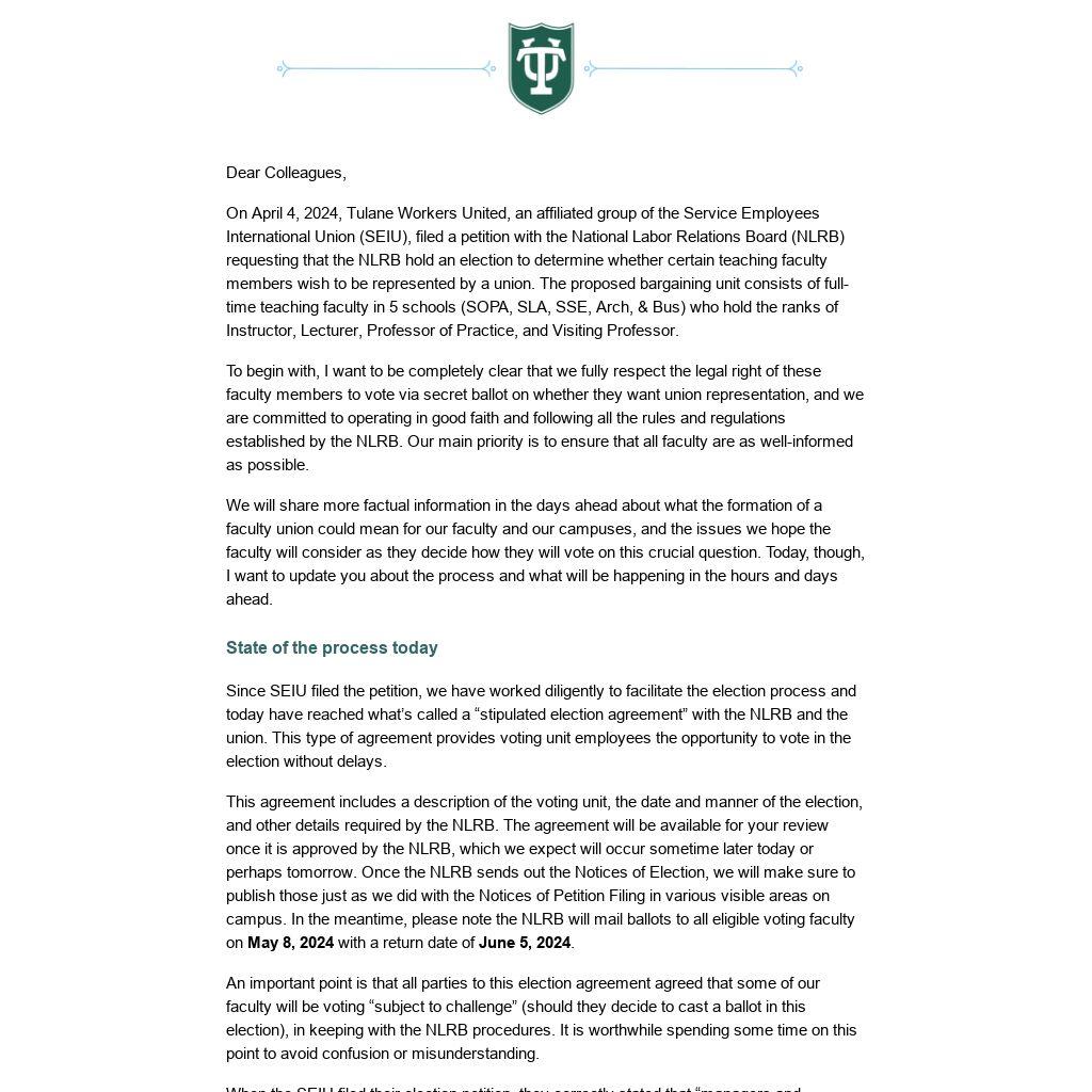 This agreement includes a description of the voting unit, the date and manner of the election, and other details required by the NLRB. The agreement will be available for your review once it is approved by the NLRB, which we expect will occur sometime later today or perhaps tomorrow. Once the NLRB sends out the Notices of Election, we will make sure to publish those just as we did with the Notices of Petition Filing in various visible areas on campus. In the meantime, please note the NLRB will mail ballots to all eligible voting faculty on May 8, 2024 with a return date of June 5, 2024.