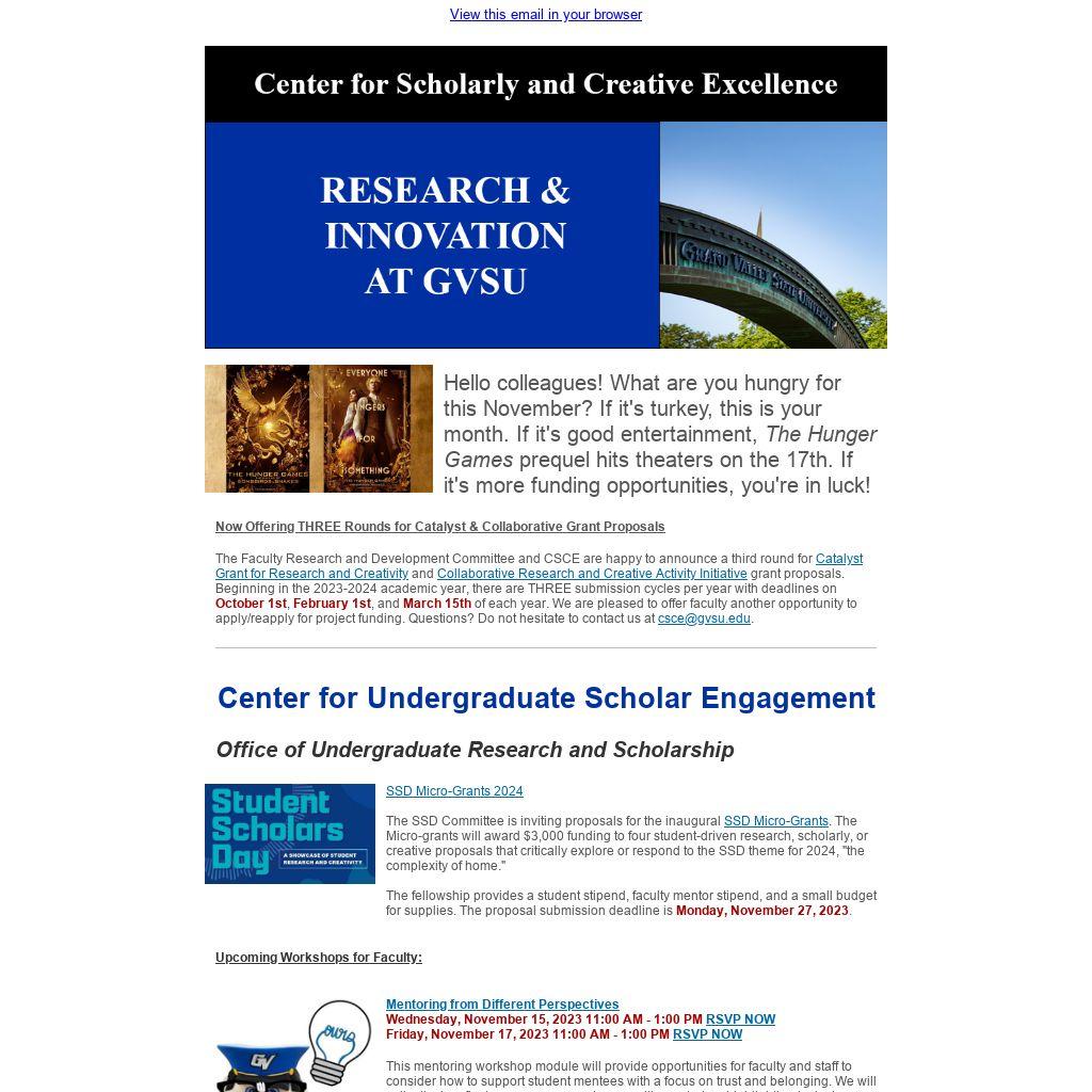 | Hello colleagues! What are you hungry for this November? If it's turkey, this is your month. If it's good entertainment, The Hunger Games prequel hits theaters on the 17th. If it's more funding opportunities, you're in luck!