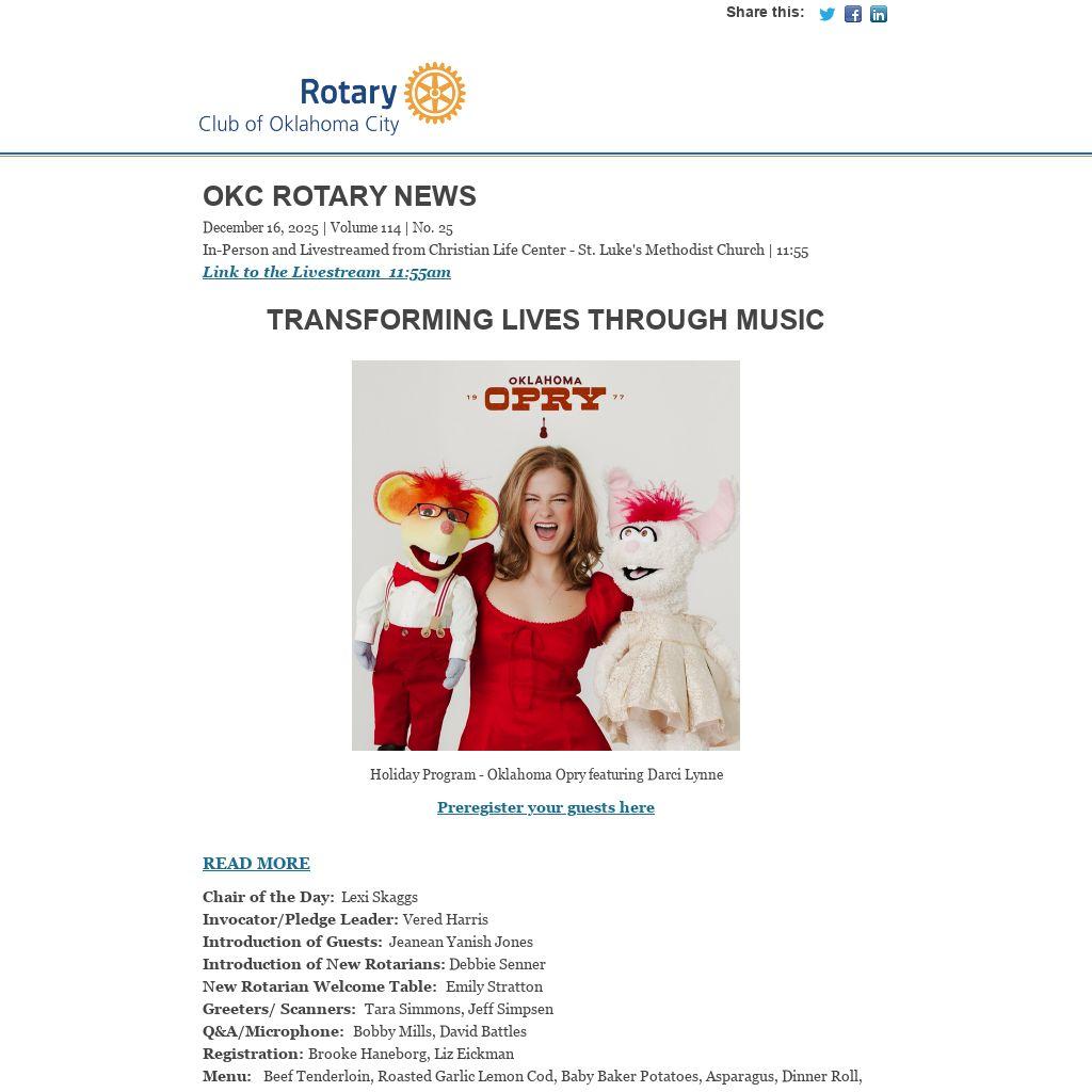 OKC ROTARY NEWSDecember 16, 2025 | Volume 114 | No. 25 In-Person and Livestreamed from Christian Life Center - St. Luke's Methodist Church | 11:55