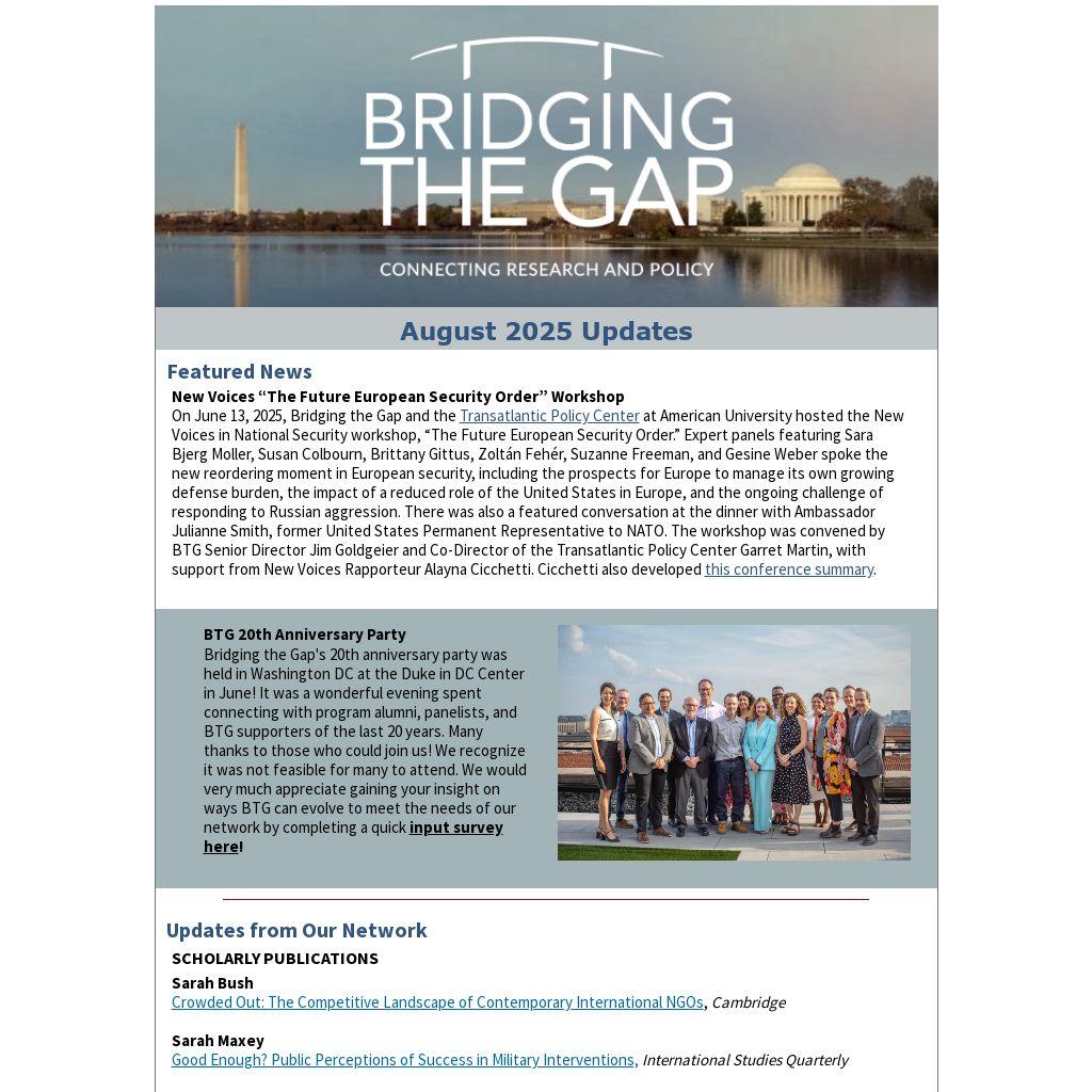 On June 13, 2025, Bridging the Gap and the Transatlantic Policy Center at American University hosted the New Voices in National Security workshop, “The Future European Security Order.” Expert panels featuring Sara Bjerg Moller, Susan Colbourn, Brittany Gittus, Zoltán Fehér, Suzanne Freeman, and Gesine Weber spoke the new reordering moment in European security, including the prospects for Europe to manage its own growing defense burden, the impact of a reduced role of the United States in Europe, and the ongoing challenge of responding to Russian aggression. There was also a featured conversation at the dinner with Ambassador Julianne Smith, former United States Permanent Representative to NATO. The workshop was convened by BTG Senior Director Jim Goldgeier and Co-Director of the Transatlantic Policy Center Garret Martin, with support from New Voices Rapporteur Alayna Cicchetti. Cicchetti also developed this conference summary.