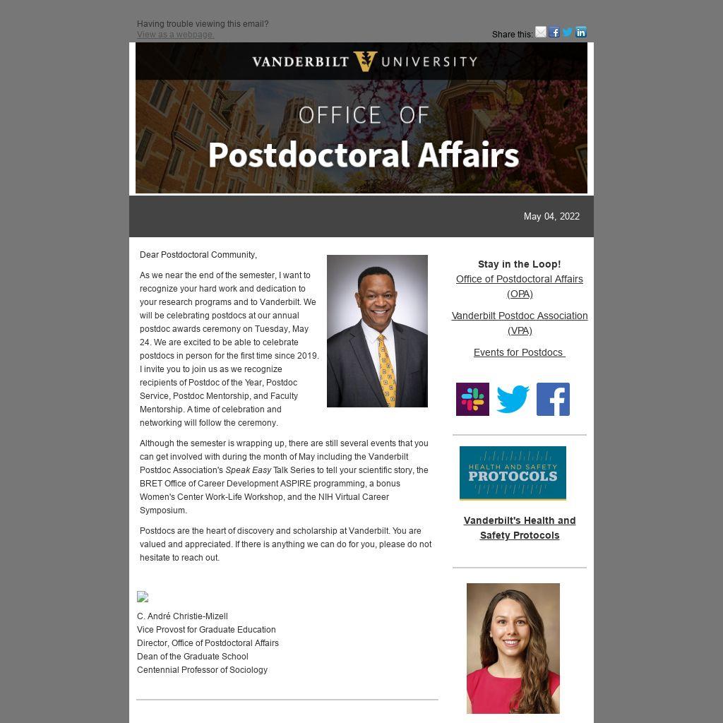 As we near the end of the semester, I want to recognize your hard work and dedication to your research programs and to Vanderbilt. We will be celebrating postdocs at our annual postdoc awards ceremony on Tuesday, May 24. We are excited to be able to celebrate postdocs in person for the first time since 2019. I invite you to join us as we recognize recipients of Postdoc of the Year, Postdoc Service, Postdoc Mentorship, and Faculty Mentorship. A time of celebration and networking will follow the ceremony.
