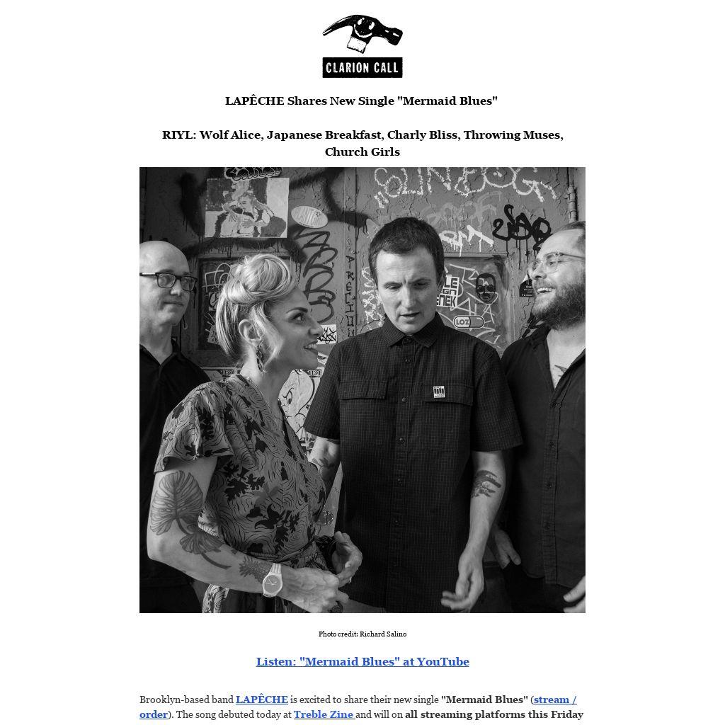 Brooklyn-based band LAPÊCHE is excited to share their new single "Mermaid Blues" (stream / order). The song debuted today at Treble Zine and will on all streaming platforms this Friday for any playlist shares. The stand alone single, “Mermaid Blues,” expands and contracts around the experience of heavy seasonal depression. Becoming desperate, hope is an imperfect skill that may guide you out.
