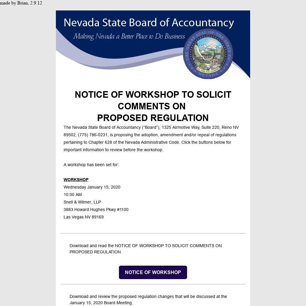 The Nevada State Board of Accountancy (“Board”), 1325 Airmotive Way, Suite 220, Reno NV 89502, (775) 786-0231, is proposing the adoption, amendment and/or repeal of regulations pertaining to Chapter 628 of the Nevada Administrative Code. Click the buttons below for important information to review before the workshop.