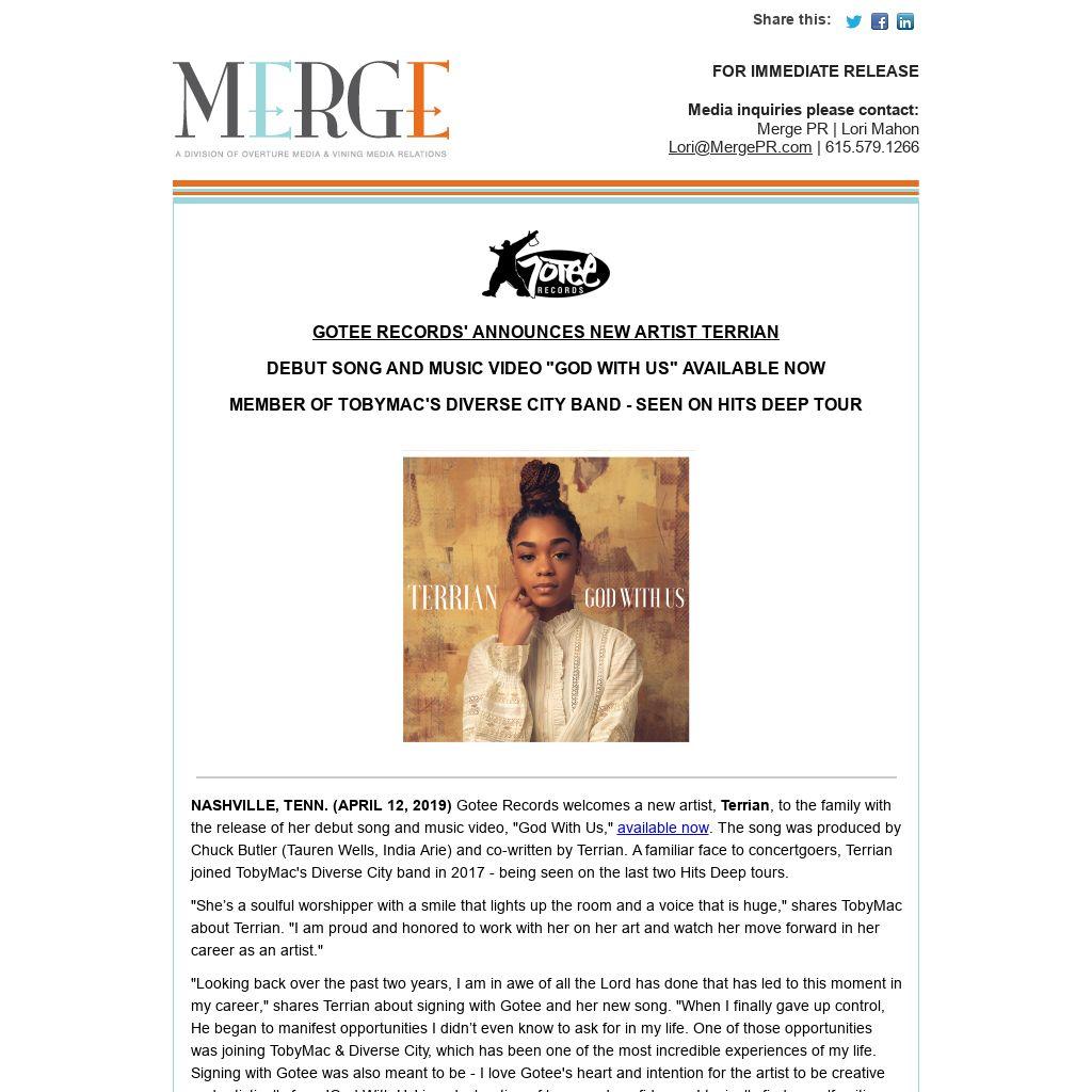NASHVILLE, TENN. (APRIL 12, 2019) Gotee Records welcomes a new artist, Terrian, to the family with the release of her debut song and music video, "God With Us," available now. The song was produced by Chuck Butler (Tauren Wells, India Arie) and co-written by Terrian. A familiar face to concertgoers, Terrian joined TobyMac's Diverse City band in 2017 - being seen on the last two Hits Deep tours. "She’s a soulful worshipper with a smile that lights up the room and a voice that is huge," shares TobyMac about Terrian. "I am proud and honored to work with her on her art and watch her move forward in her career as an artist."