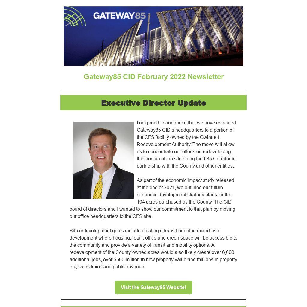 I am proud to announce that we have relocated Gateway85 CID’s headquarters to a portion of the OFS facility owned by the Gwinnett Redevelopment Authority. The move will allow us to concentrate our efforts on redeveloping this portion of the site along the I-85 Corridor in partnership with the County and other entities.