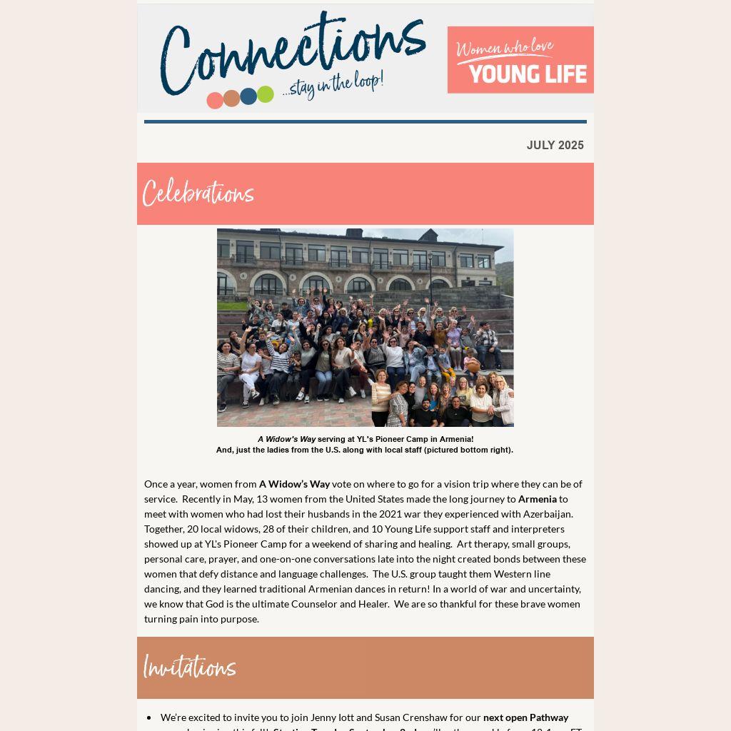 Once a year, women from A Widow’s Way vote on where to go for a vision trip where they can be of service. Recently in May, 13 women from the United States made the long journey to Armenia to meet with women who had lost their husbands in the 2021 war they experienced with Azerbaijan. Together, 20 local widows, 28 of their children, and 10 Young Life support staff and interpreters showed up at YL's Pioneer Camp for a weekend of sharing and healing. Art therapy, small groups, personal care, prayer, and one-on-one conversations late into the night created bonds between these women that defy distance and language challenges. The U.S. group taught them Western line dancing, and they learned traditional Armenian dances in return! In a world of war and uncertainty, we know that God is the ultimate Counselor and Healer. We are so thankful for these brave women turning pain into purpose.