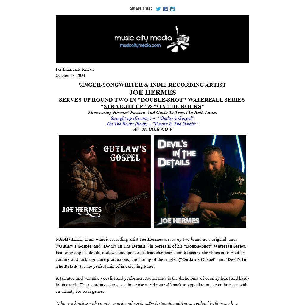 Hermes introduces Double-Shot Series II with the simultaneous release of “Outlaw's Gospel" (a “Straight Up” country tune) and “Devil's In The Details” (“On The Rocks” rock tune) AVAILABLE NOW on all streaming platforms.