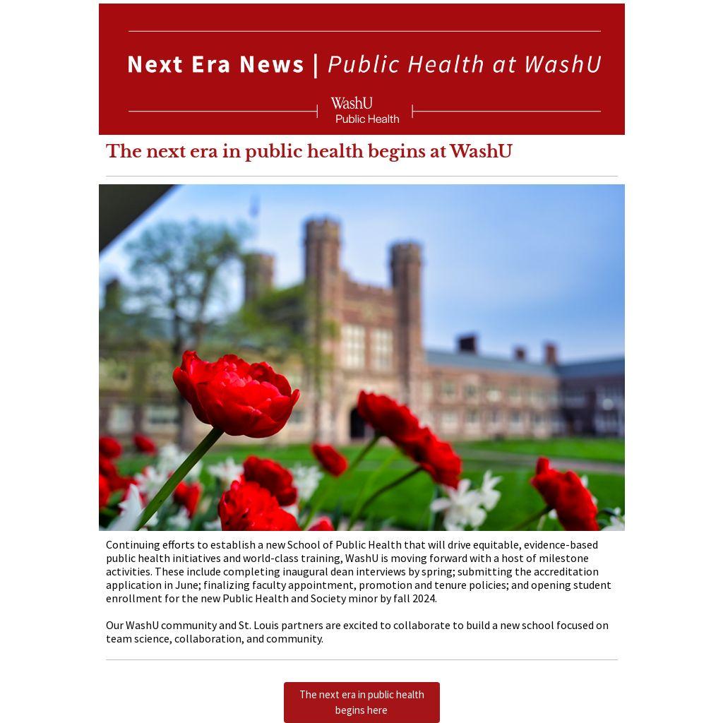 Continuing efforts to establish a new School of Public Health that will drive equitable, evidence-based public health initiatives and world-class training, WashU is moving forward with a host of milestone activities. These include completing inaugural dean interviews by spring; submitting the accreditation application in June; finalizing faculty appointment, promotion and tenure policies; and opening student enrollment for the new Public Health and Society minor by fall 2024.