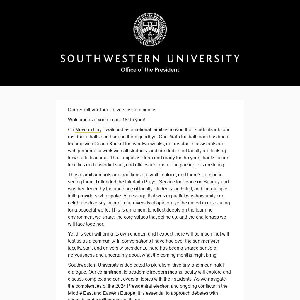 Southwestern University is dedicated to pluralism, diversity, and meaningful dialogue. Our commitment to academic freedom means faculty will explore and discuss complex and controversial topics with their students. As we navigate the complexities of the 2024 Presidential election and ongoing conflicts in the Middle East and Eastern Europe, it is essential to approach debates with curiosity and a willingness to listen.