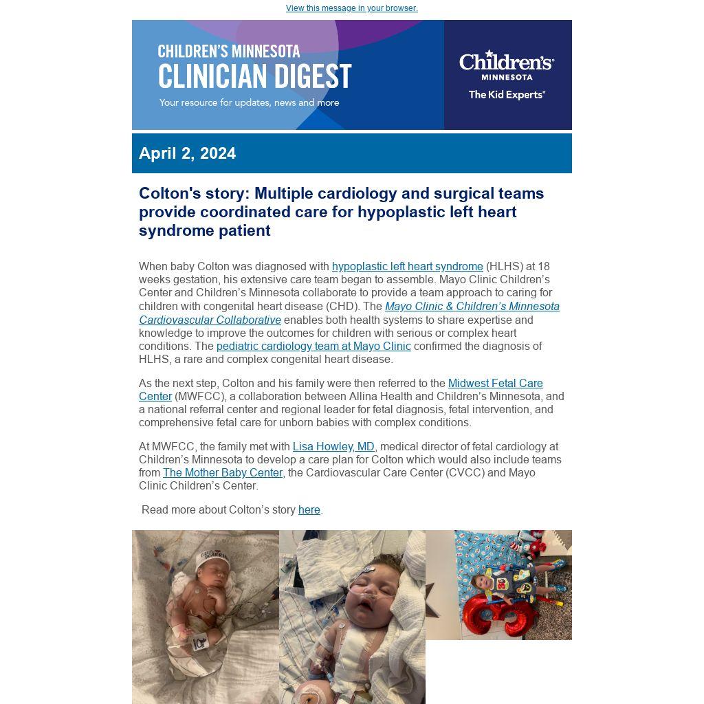 If you find this newsletter valuable, we invite you to send this email to your colleagues so that they can learn about what's happening at Children's Minnesota. If this email was forwarded to you, we encourage you to sign up for the Children's Minnesota Clinician Digest.