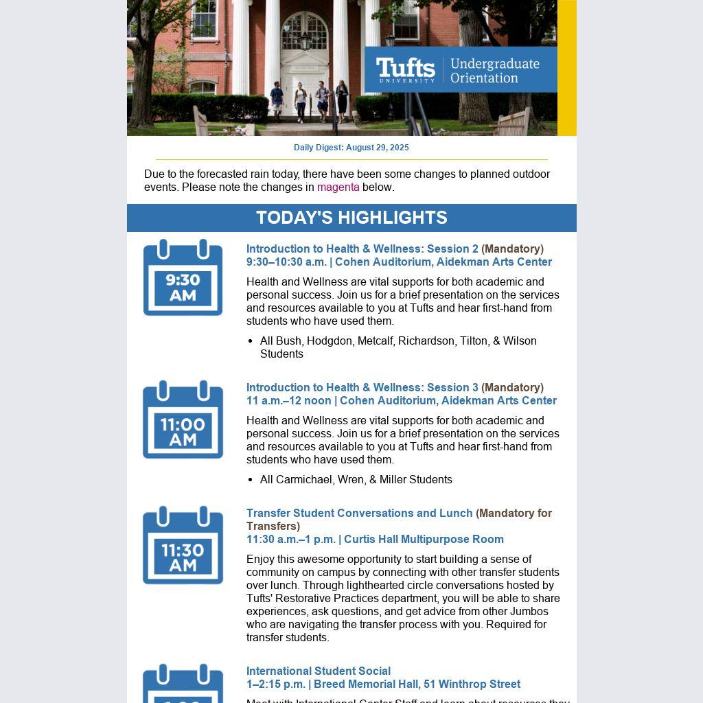 Tufts University Undergraduate Orientation is committed to providing equal access to our services, events and programs. If you require accommodations for any part of Undergraduate Orientation, please contact orientation@tufts.edu or 617-627-4678.