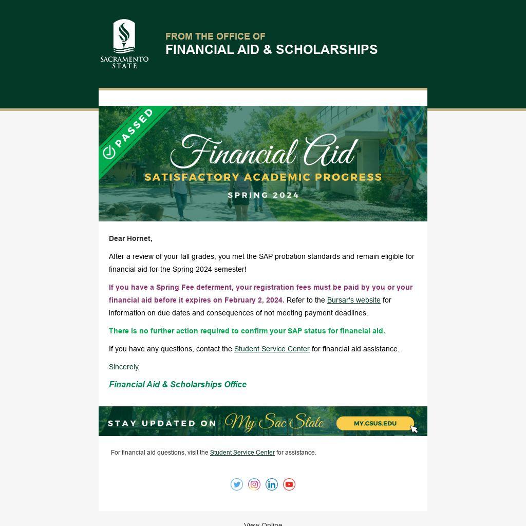 After a review of your fall grades, you met the SAP probation standards and remain eligible for financial aid for the Spring 2024 semester!