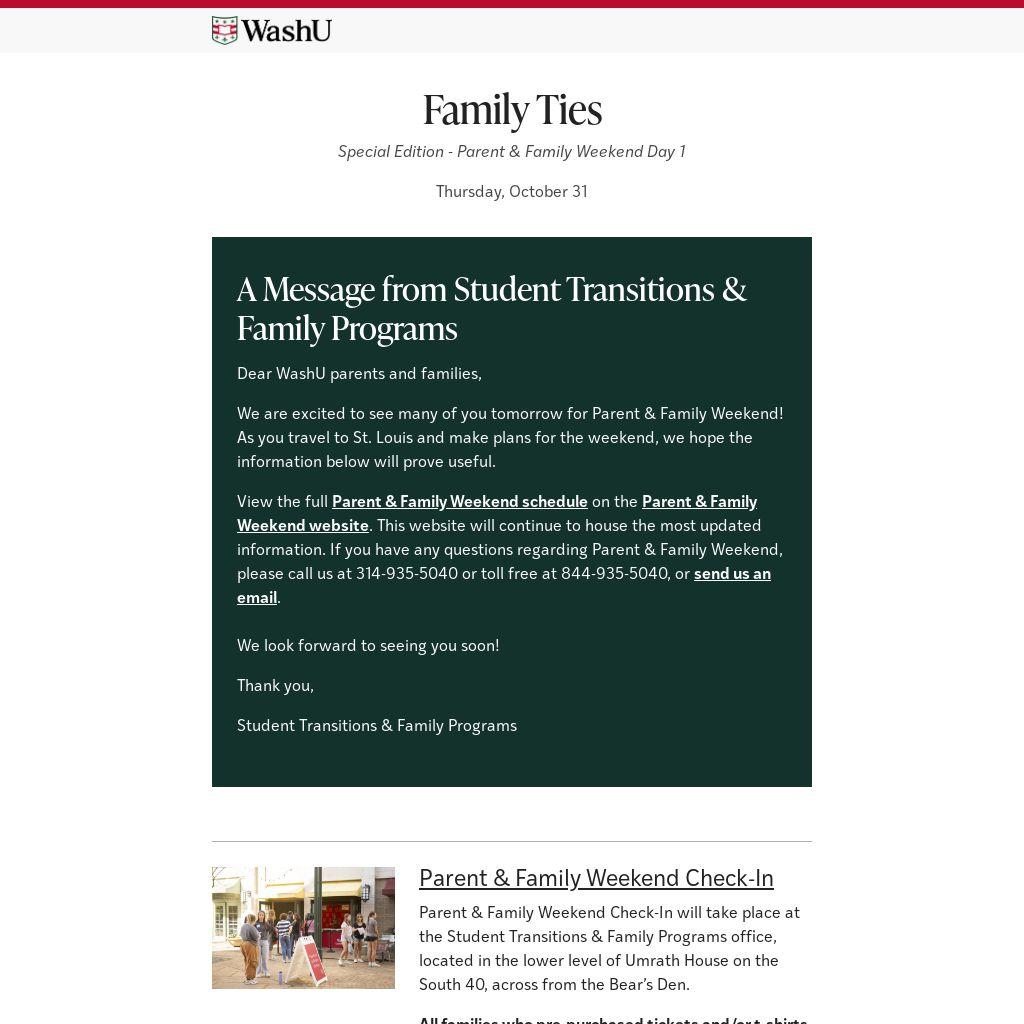 View the full Parent & Family Weekend schedule on the Parent & Family Weekend website. This website will continue to house the most updated information. If you have any questions regarding Parent & Family Weekend, please call us at 314-935-5040 or toll free at 844-935-5040, or send us an email.