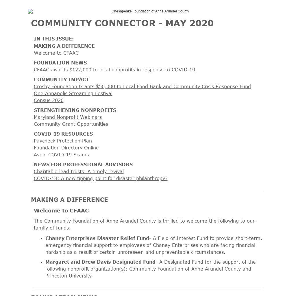 The Community Foundation of Anne Arundel County (CFAAC) is a tax-exempt, 501(c)(3), publicly supported philanthropic organization with the long-term goal of building permanent funds that provide support to local nonprofit organizations through grants and special projects. Our mission is to inspire and promote giving in Anne Arundel County by connecting people who care with causes that matter. Established in 1998, CFAAC is one of the largest funders of nonprofit organizations in Anne Arundel County. CFAAC distributed nearly $3 million in 2019. Learn more at www.cfaac.org.