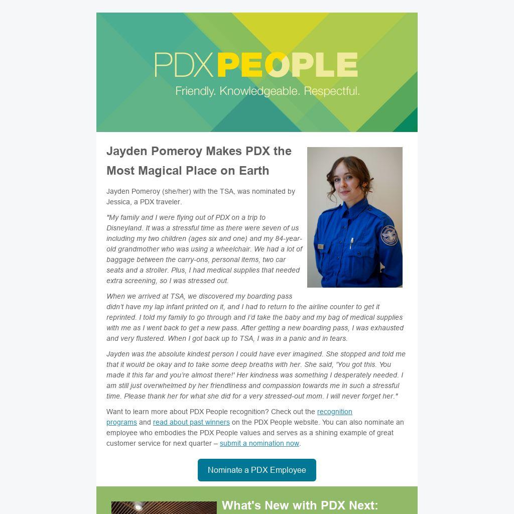 Jayden Pomeroy (she/her) with the TSA, was nominated by Jessica, a PDX traveler.