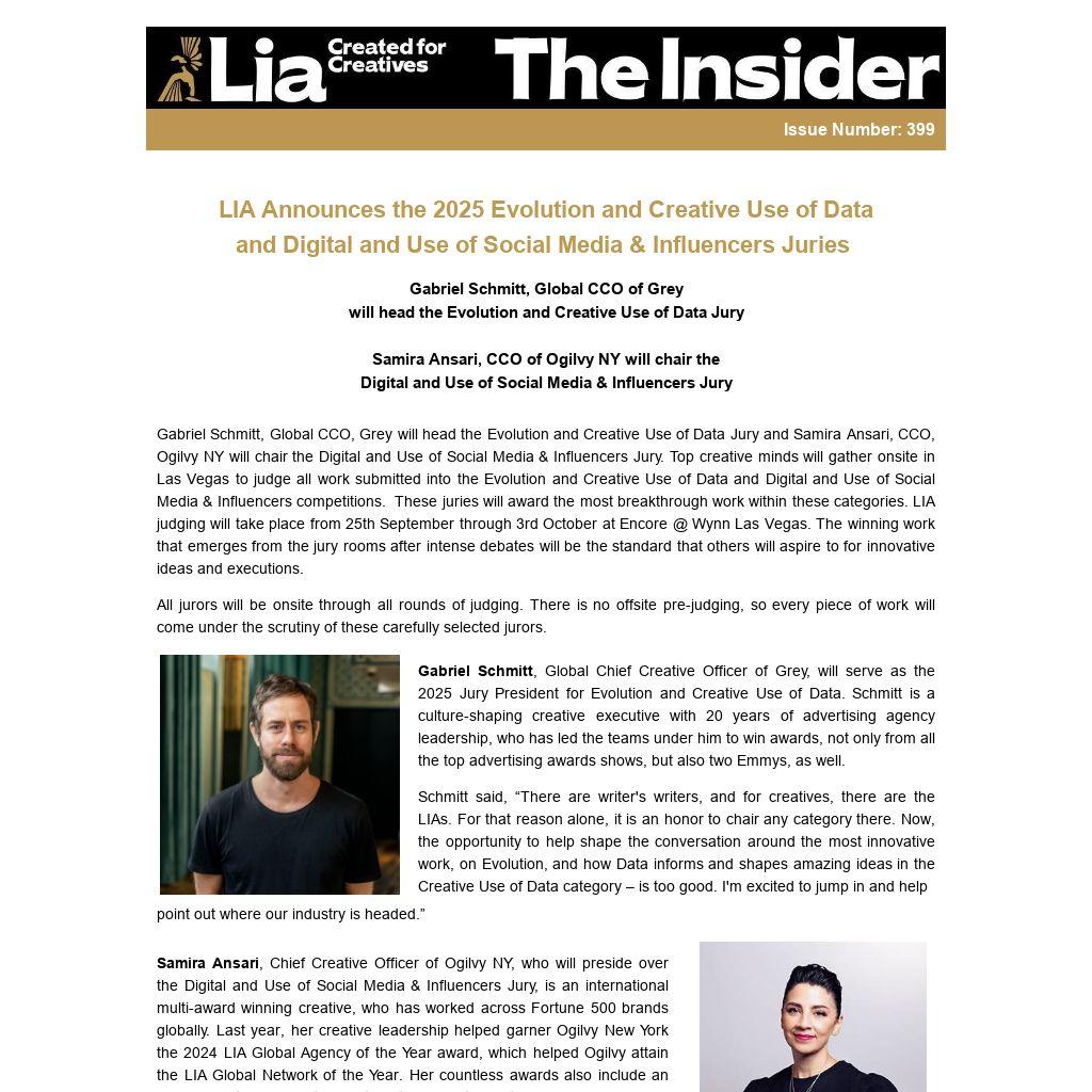 Schmitt said, “There are writer's writers, and for creatives, there are the LIAs. For that reason alone, it is an honor to chair any category there. Now, the opportunity to help shape the conversation around the most innovative work, on Evolution, and how Data informs and shapes amazing ideas in the Creative Use of Data category – is too good. I'm excited to jump in and help