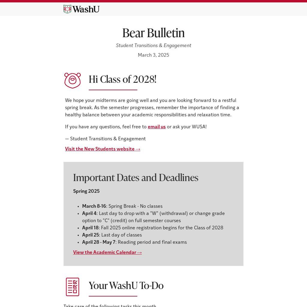 We hope your midterms are going well and you are looking forward to a restful spring break. As the semester progresses, remember the importance of finding a healthy balance between your academic responsibilities and relaxation time.
