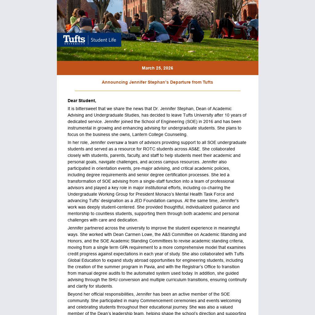It is bittersweet that we share the news that Dr. Jennifer Stephan, Dean of Academic Advising and Undergraduate Studies, has decided to leave Tufts University after 10 years of dedicated service. Jennifer joined the School of Engineering (SOE) in 2016 and has been instrumental in growing and enhancing advising for undergraduate students. She plans to focus on the business she owns, Lantern College Counseling.