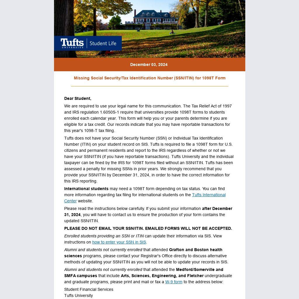 Tufts does not have your Social Security Number (SSN) or Individual Tax Identification Number (ITIN) on your student record on SIS. Tufts is required to file a 1098T form for U.S. citizens and permanent residents and report to the IRS regardless of whether or not we have your SSN/ITIN (if you have reportable transactions). Tufts University and the individual taxpayer can be fined by the IRS for 1098T forms filed without an SSN/ITIN. Tufts has been assessed a penalty for missing SSNs in prior years. We strongly recommend that you provide your SSN/ITIN by December 31, 2024, in order to have the correct information for this IRS reporting.