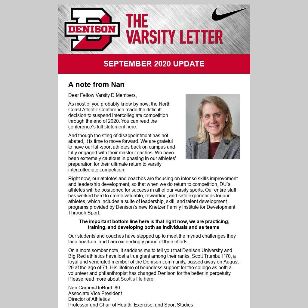 As always, please let us know if we can be of service to you in any way. Also, we value the opinions of our former athletes and other family and friends, so feel free to pass along any feedback you might have regarding Denison athletics.