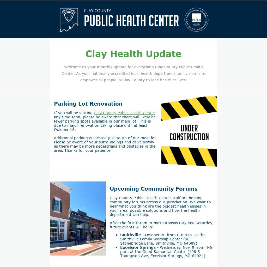 Welcome to your monthly update for everything Clay County Public Health Center. As your nationally-accredited local health department, our vision is to empower all people in Clay County to lead healthier lives.