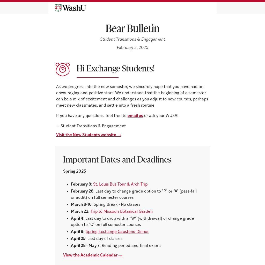 Meet your WUSAs and fellow exchange students at the Alumni Lot at 9:50 AM on February 8 for a free trip to and in the Gateway Arch and St. Louis Bus tour with a Missouri History Museum Guide. The bus will leave promptly at 10:00 AM. We will return to campus at 2:00 PM.