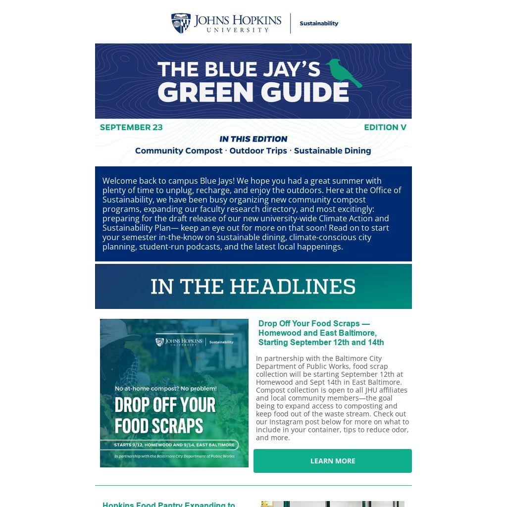 In partnership with the Baltimore City Department of Public Works, food scrap collection will be starting September 12th at Homewood and Sept 14th in East Baltimore. Compost collection is open to all JHU affiliates and local community members—the goal being to expand access to composting and keep food out of the waste stream. Check out our Instagram post below for more on what to include in your container, tips to reduce odor, and more.