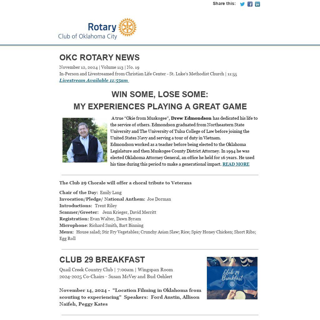 Rotary Club 29 has an online membership directory which contains current content information for all club members. The link to access the Club 29 directory can be found at the top of  the home page of  okcrotary.com or by clicking  here.