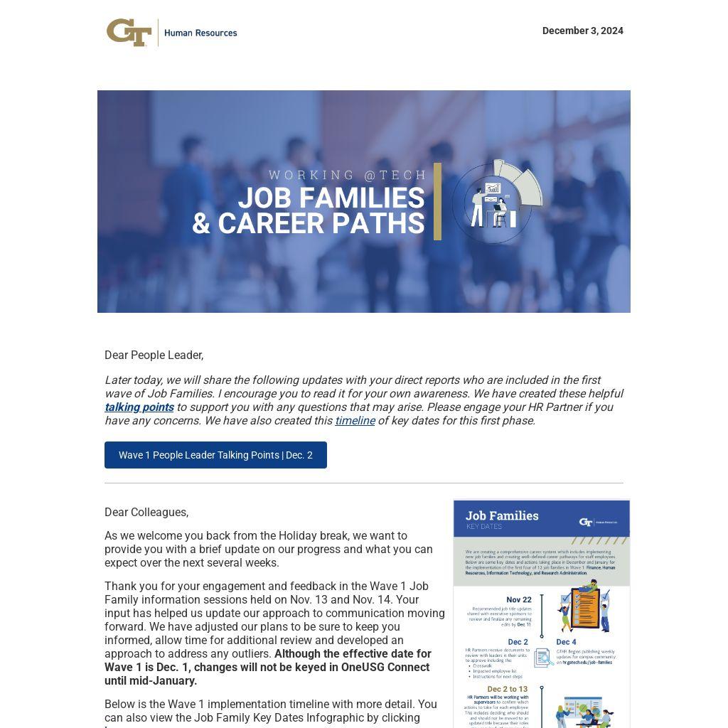 Below is the Wave 1 implementation timeline with more detail. You can also view the Job Family Key Dates Infographic by clicking here: