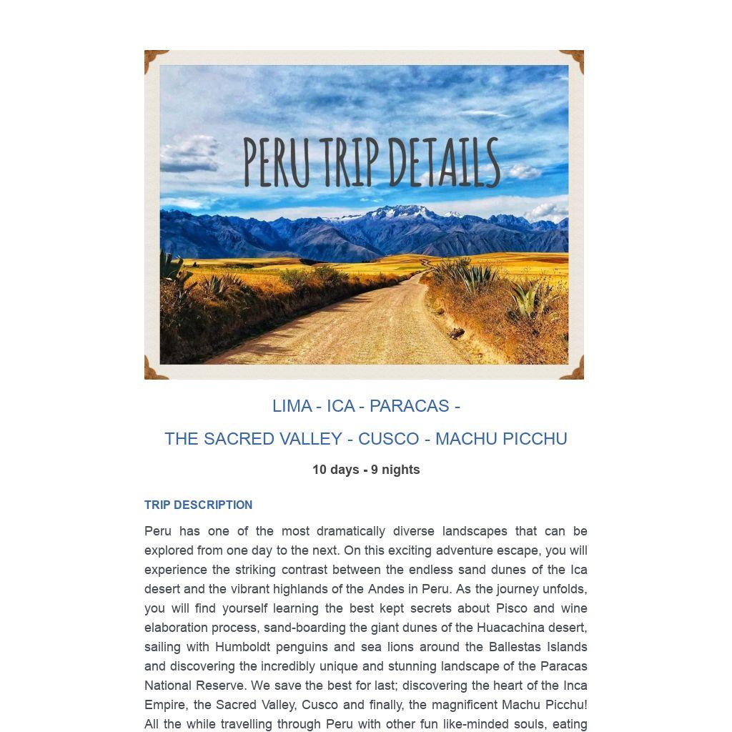 Contact us for more information on how to join us in Peru. Spots are limited to only a few so join now as spaces will fill up fast! Once you sign up, we'll send you a complete packing list and more information on how to prepare for this exciting Escape!