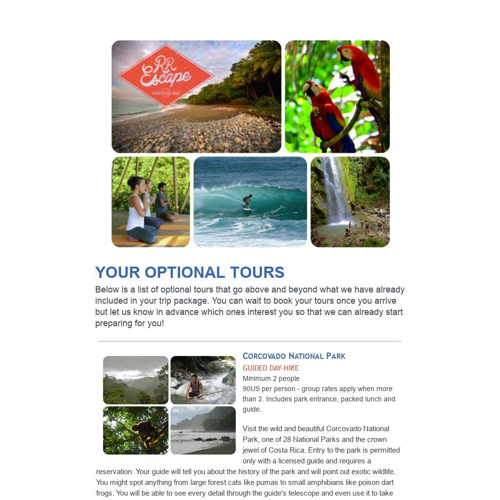 All tours can be arranged once on-site. There is no commitment needed in advance except for the three-day tour into Corcovado Park. Payment for the tours is done at the beginning of your stay in USD cash so please bring sufficient funds. Tours are non-refundable unless cancelled by the provider due to weather. Note that the price is subject to change and that some tours may not be available if we do not have the minimum number of people required. That being said, in most cases, we can organize any tours only that the price of the tour and the transportation would likely be more than what is listed above.