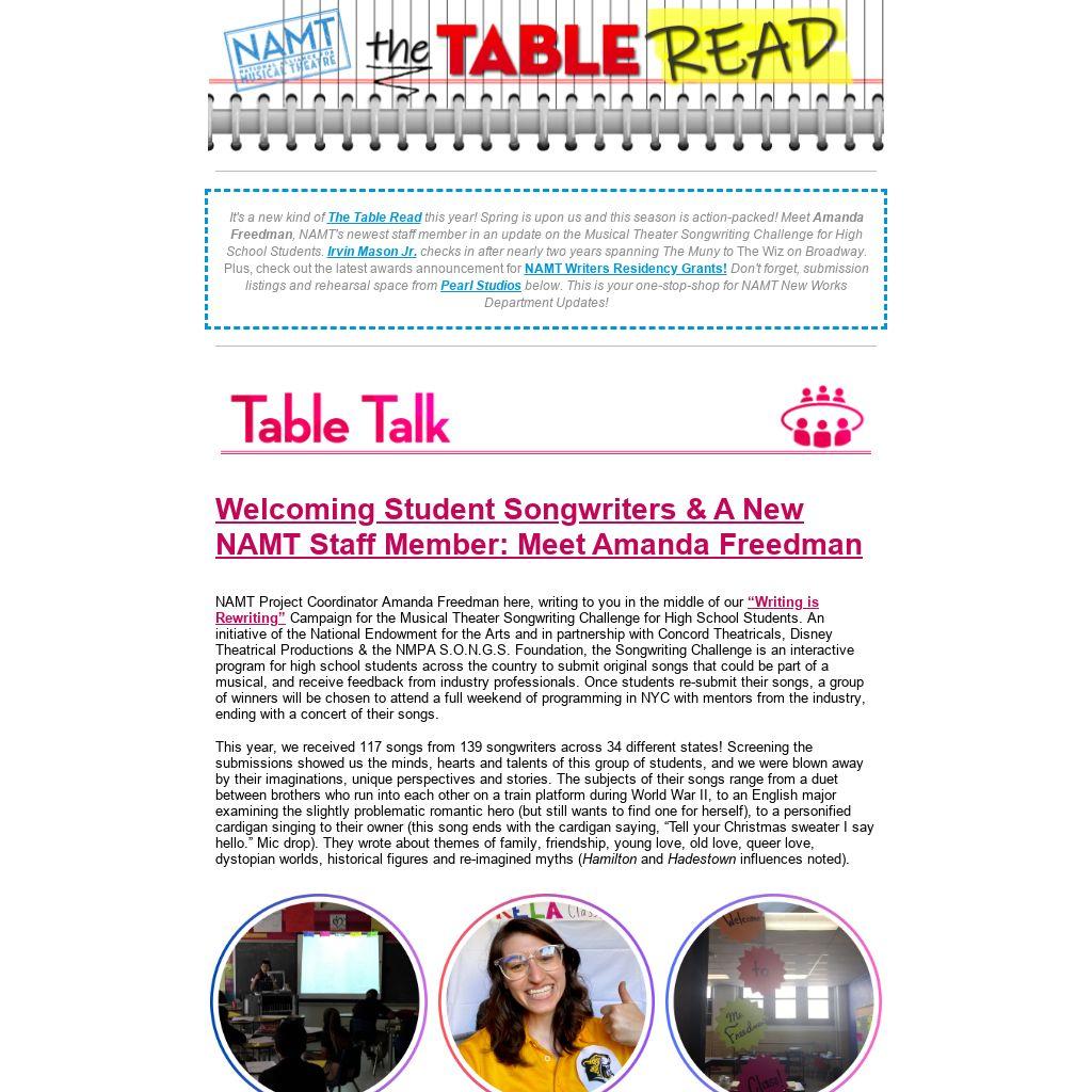 It's a new kind of The Table Read this year! Spring is upon us and this season is action-packed! Meet Amanda Freedman, NAMT's newest staff member in an update on the Musical Theater Songwriting Challenge for High School Students. Irvin Mason Jr. checks in after nearly two years spanning The Muny to The Wiz on Broadway. Plus, check out the latest awards announcement for NAMT Writers Residency Grants! Don't forget, submission listings and rehearsal space from Pearl Studios below. This is your one-stop-shop for NAMT New Works Department Updates!
