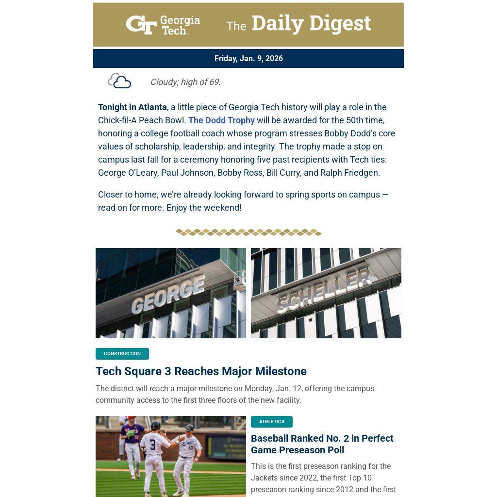 In preparation for construction on Techwood Drive, the road between Bobby Dodd Way and Fourth Street is closed to vehicular and pedestrian traffic. It is expected to reopen on Sunday, Jan. 11.