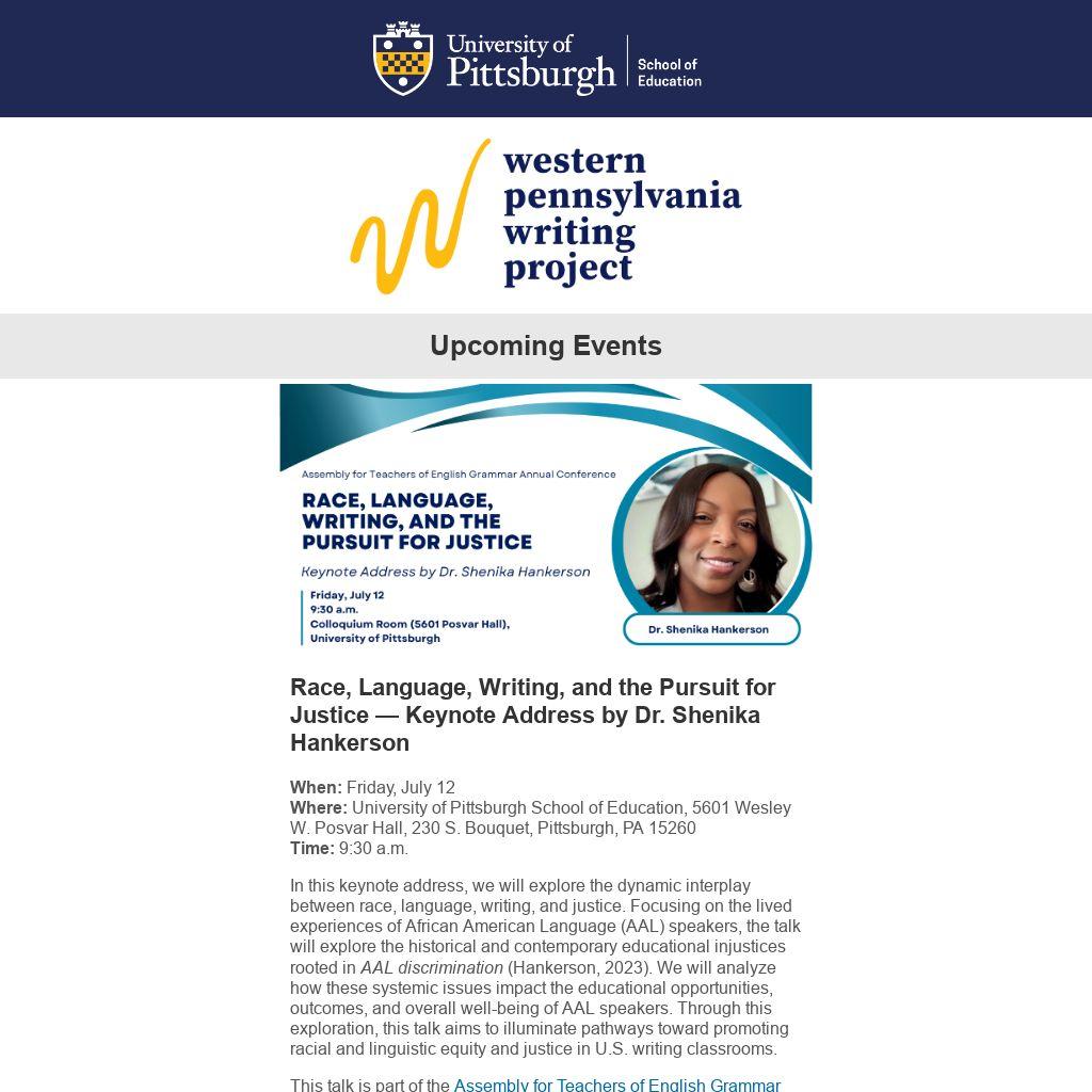 In this keynote address, we will explore the dynamic interplay between race, language, writing, and justice. Focusing on the lived experiences of African American Language (AAL) speakers, the talk will explore the historical and contemporary educational injustices rooted in AAL discrimination (Hankerson, 2023). We will analyze how these systemic issues impact the educational opportunities, outcomes, and overall well-being of AAL speakers. Through this exploration, this talk aims to illuminate pathways toward promoting racial and linguistic equity and justice in U.S. writing classrooms.