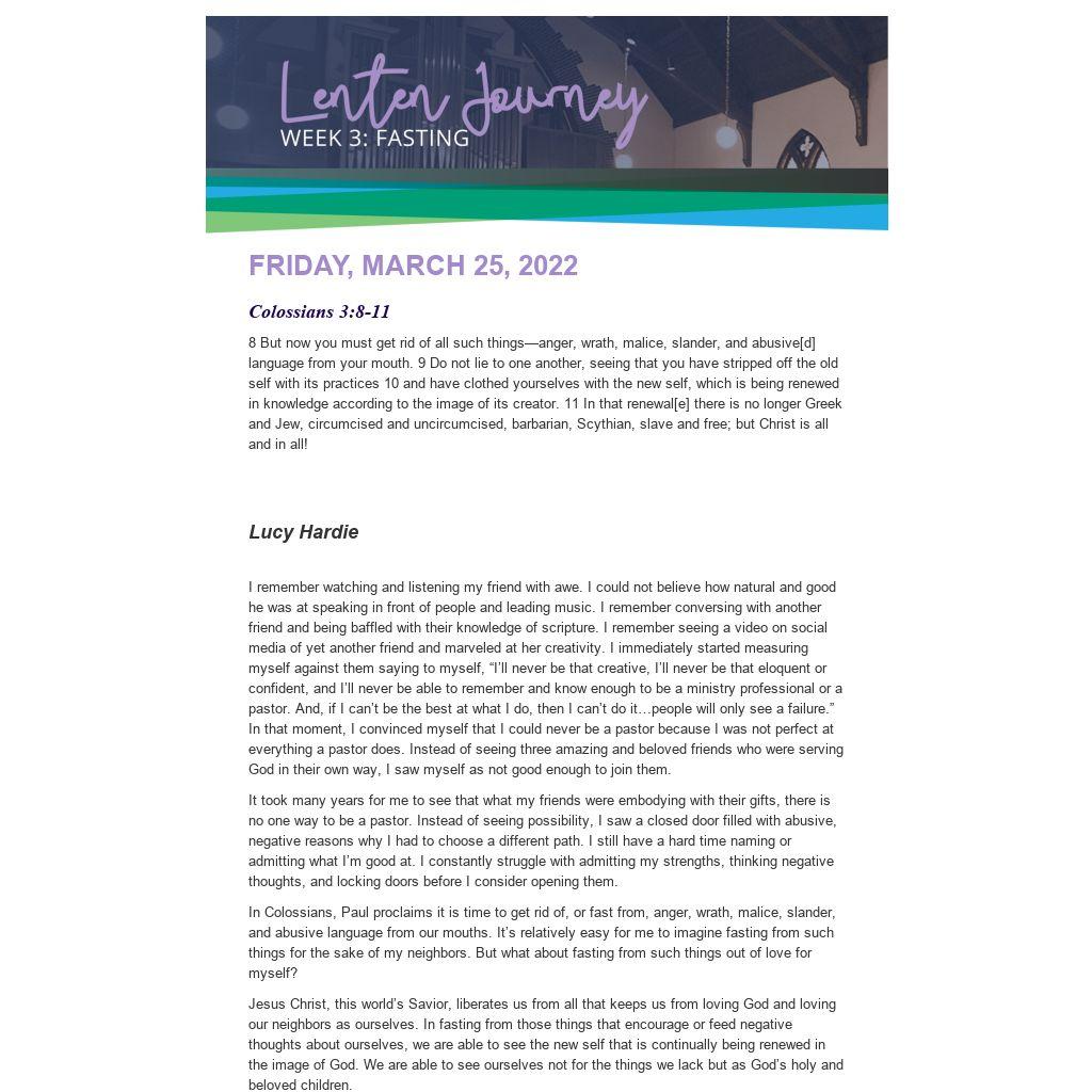 Jesus Christ, this world’s Savior, liberates us from all that keeps us from loving God and loving our neighbors as ourselves. In fasting from those things that encourage or feed negative thoughts about ourselves, we are able to see the new self that is continually being renewed in the image of God. We are able to see ourselves not for the things we lack but as God’s holy and beloved children.