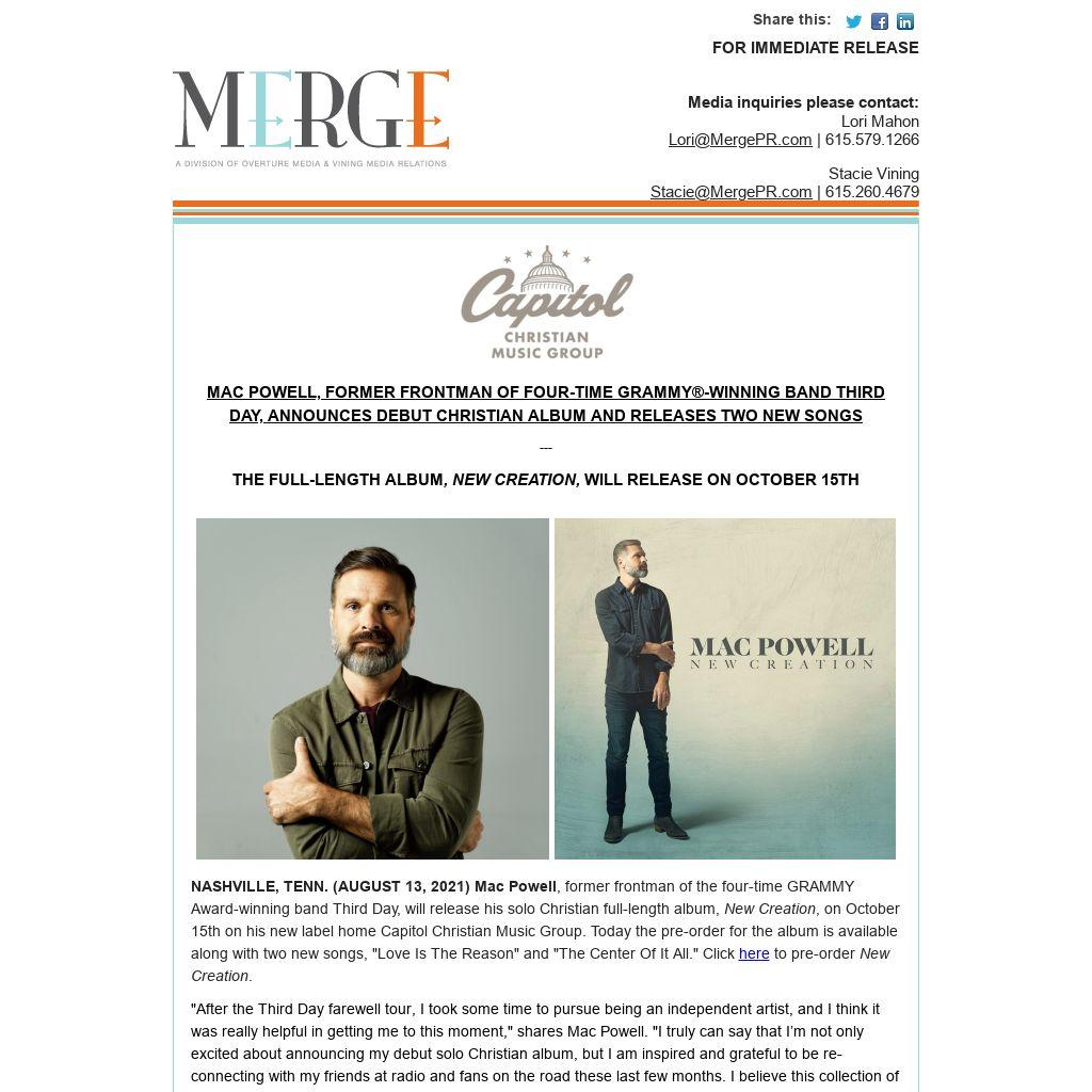 NASHVILLE, TENN. (AUGUST 13, 2021) Mac Powell, former frontman of the four-time GRAMMY Award-winning band Third Day, will release his solo Christian full-length album, New Creation, on October 15th on his new label home Capitol Christian Music Group. Today the pre-order for the album is available along with two new songs, "Love Is The Reason" and "The Center Of It All." Click here to pre-order New Creation.