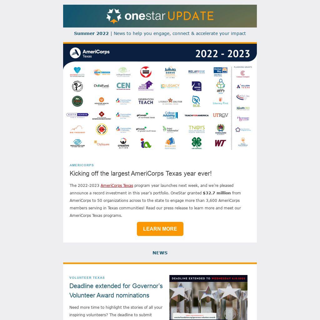 Join us in welcoming new OneStar staff members Chris Johnson, Program Officer, and Kaylee Romero, Grants Officer! These two stellar additions to the AmeriCorps Texas team bring years of experience in national service and will provide valuable insight and support to our grantees. Read bios of the OneStar staff & board >