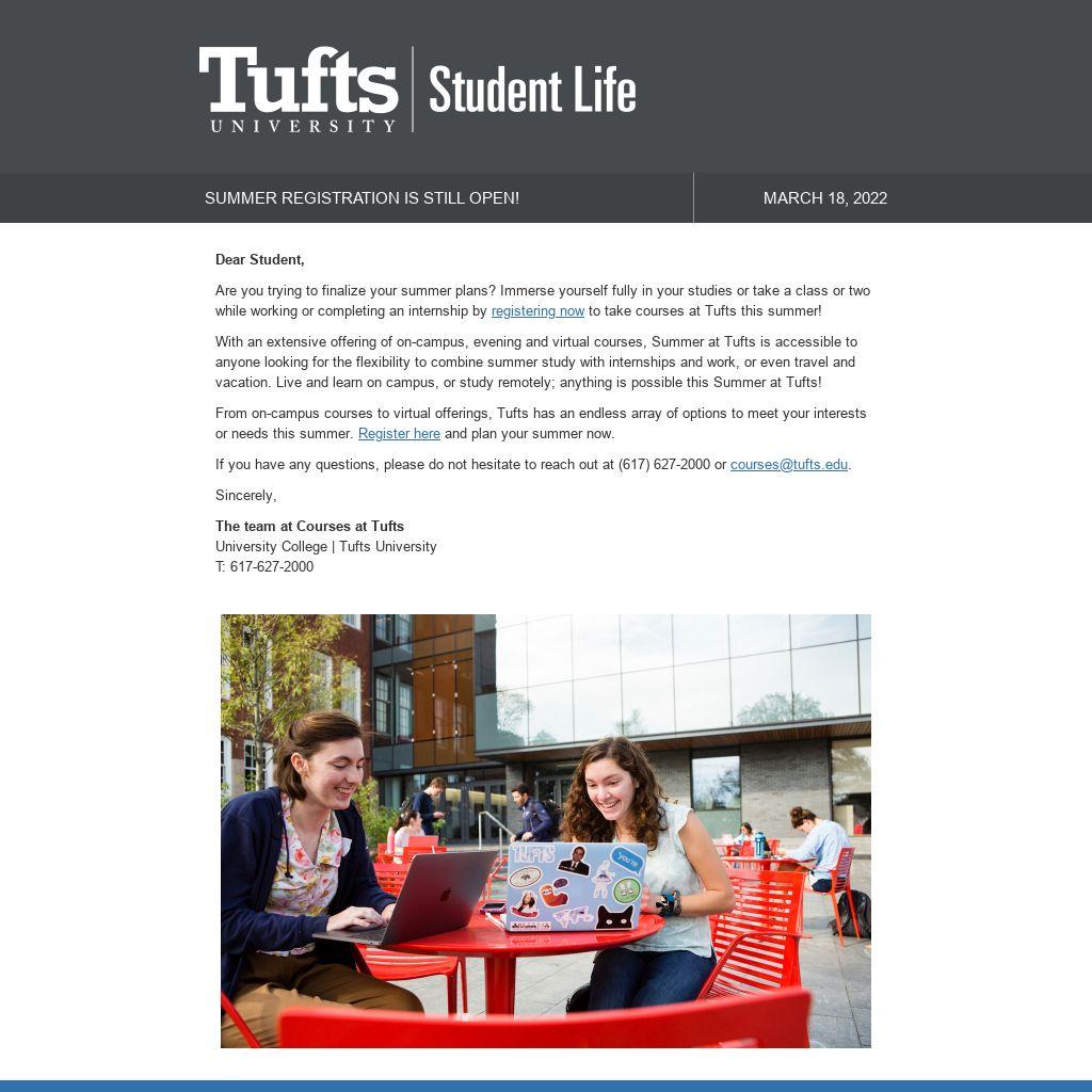 From on-campus courses to virtual offerings, Tufts has an endless array of options to meet your interests or needs this summer. Register here and plan your summer now.