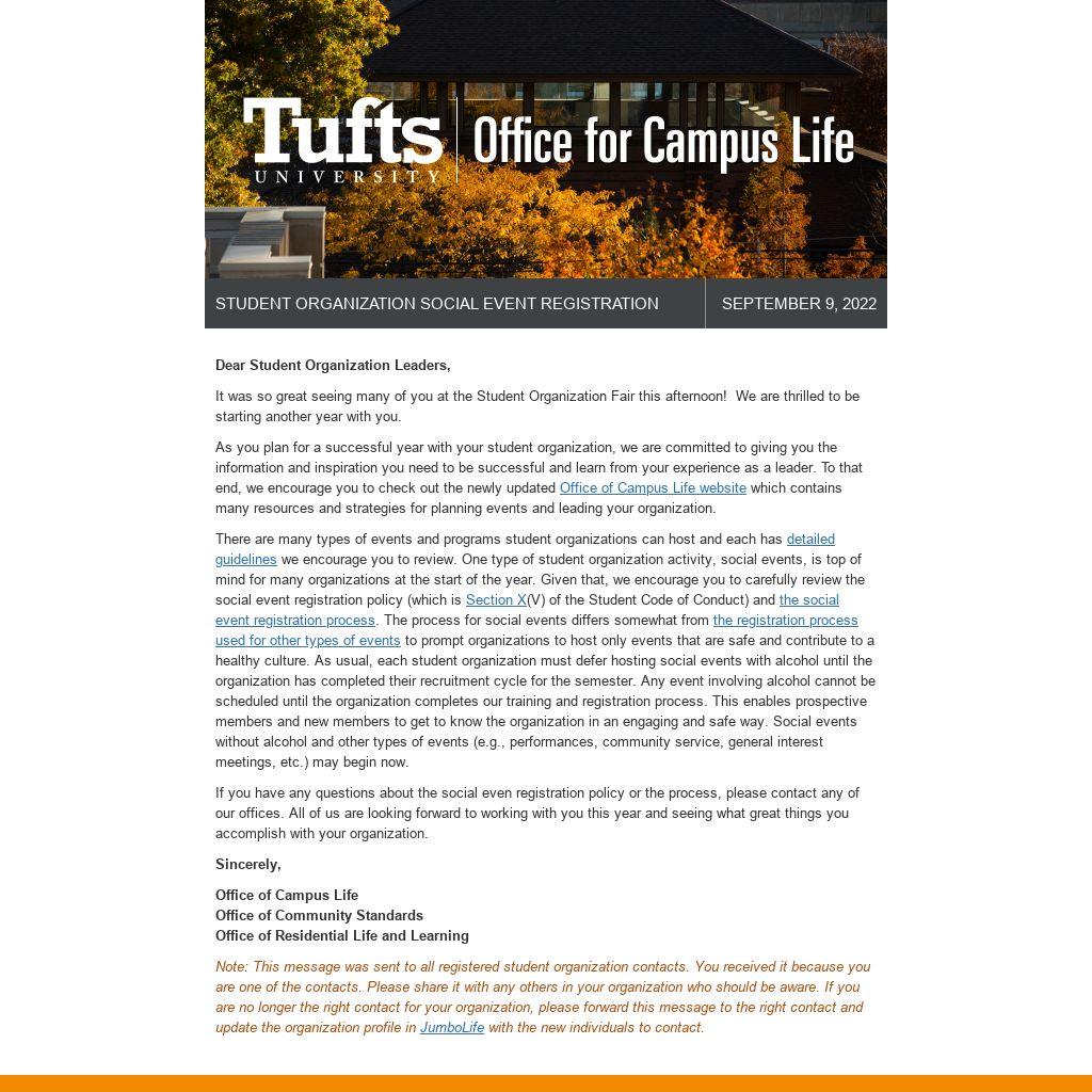 Note: This message was sent to all registered student organization contacts. You received it because you are one of the contacts. Please share it with any others in your organization who should be aware. If you are no longer the right contact for your organization, please forward this message to the right contact and update the organization profile in JumboLife with the new individuals to contact.