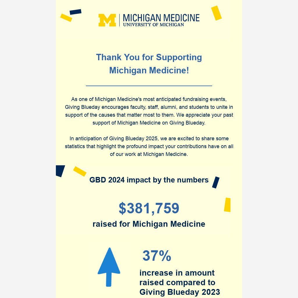 As one of Michigan Medicine's most anticipated fundraising events, Giving Blueday encourages faculty, staff, alumni, and students to unite in support of the causes that matter most to them. We appreciate your past support of Michigan Medicine on Giving Blueday.