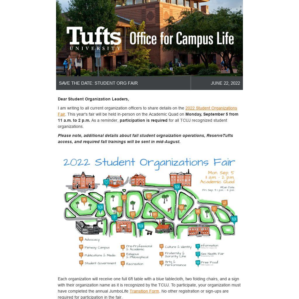 Please note, additional details about fall student orgnaization operations, ReserveTufts access, and required fall trainings will be sent in mid-August.