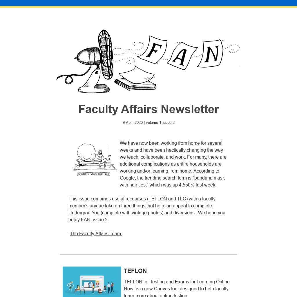 This issue combines useful recourses (TEFLON and TLC) with a faculty member's unique take on three things that help, an appeal to complete Undergrad You (complete with vintage photos) and diversions. We hope you enjoy FAN, issue 2.