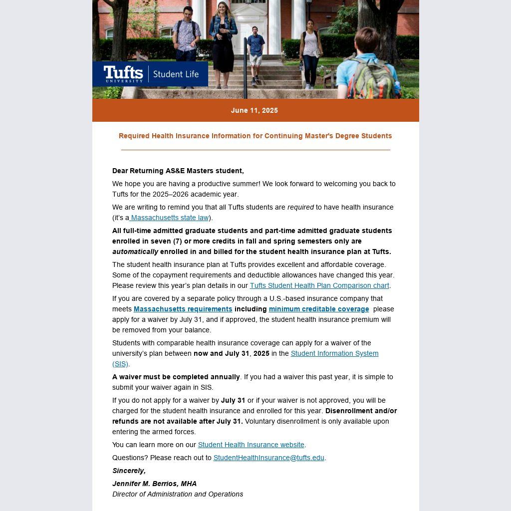 Students with comparable health insurance coverage can apply for a waiver of the university’s plan between now and July 31, 2025 in the Student Information System (SIS).