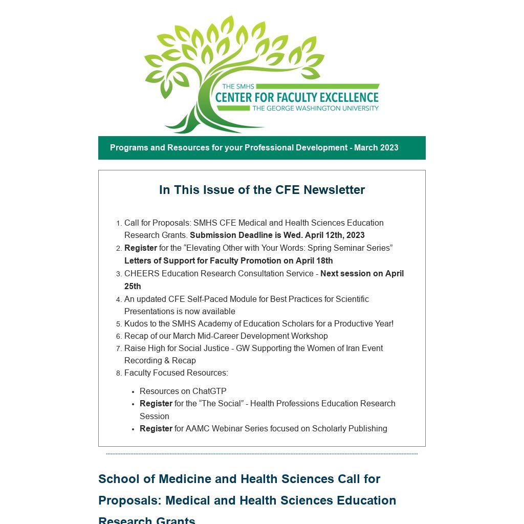- Call for Proposals: SMHS CFE Medical and Health Sciences Education Research Grants. Submission Deadline is Wed. April 12th, 2023