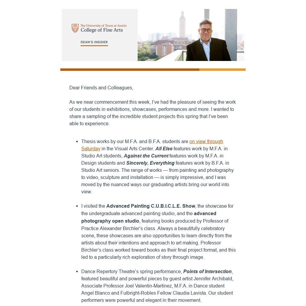 A significant number of our students are about to reach their biggest accomplishment: receiving their diploma from The University of Texas at Austin. I look forward to honoring and celebrating them at our undergraduate commencement this Friday and through the weekend with our master’s and doctoral ceremonies and at the university’s main commencement event in the stadium.