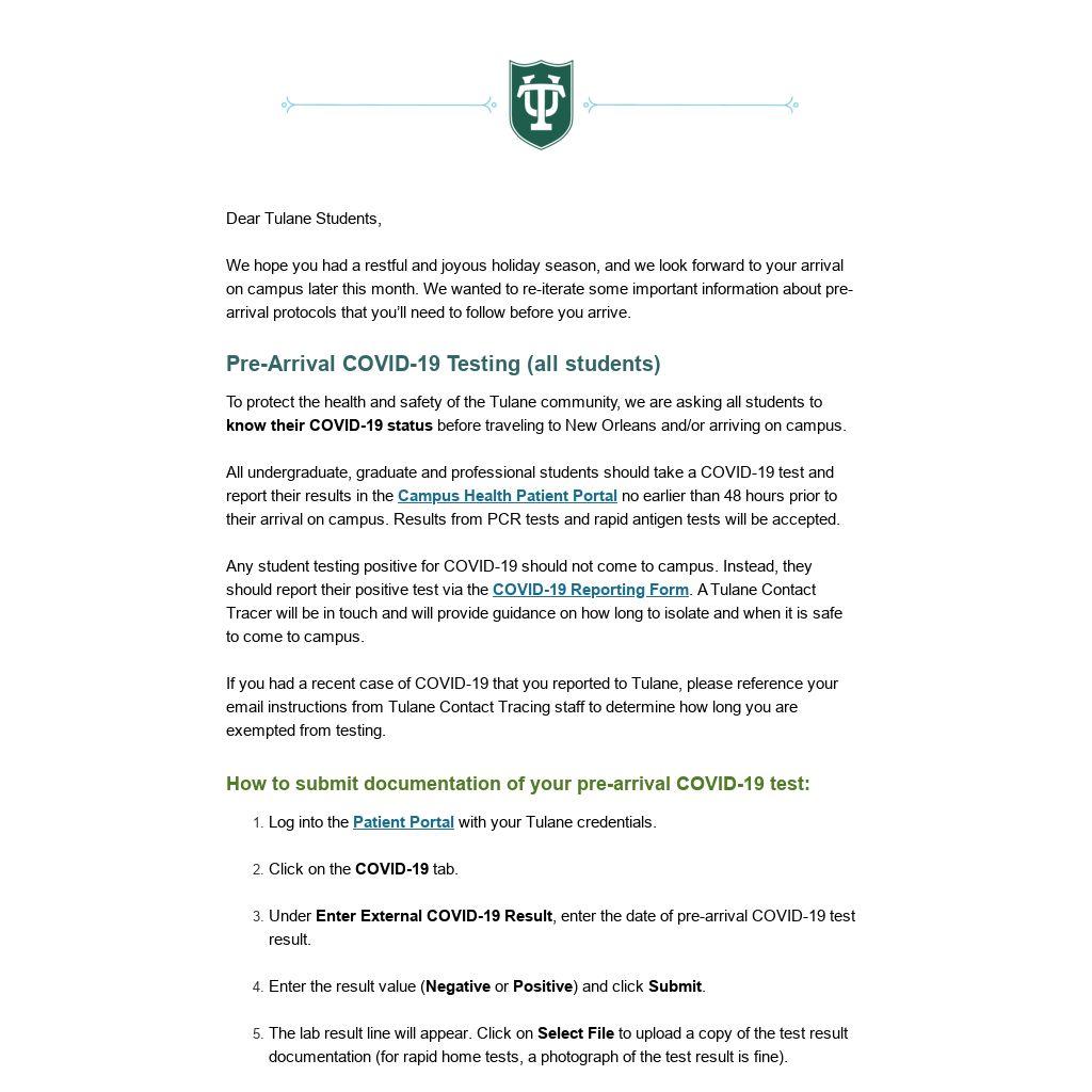 To protect the health and safety of the Tulane community, we are asking all students to know their COVID-19 status before traveling to New Orleans and/or arriving on campus.