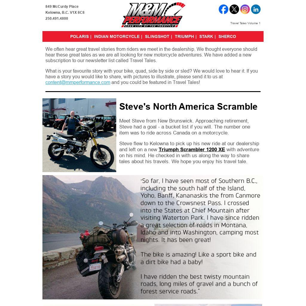 We often hear great travel stories from riders we meet in the dealership. We thought everyone should hear these great tales as we are all looking for new motorcycle adventures. We have added a new subscription to our newsletter list called Travel Tales.